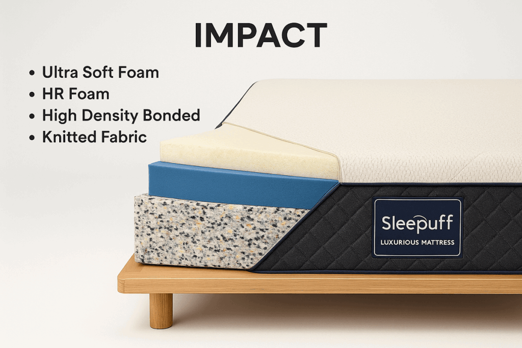 ‘Impact’ by Sleepuff is not just a mattress—it’s a wellness solution designed for luxury living. Whether you're upgrading your current setup or investing in quality sleep, this mattress offers everything you need: support, softness, breathability, and durability.